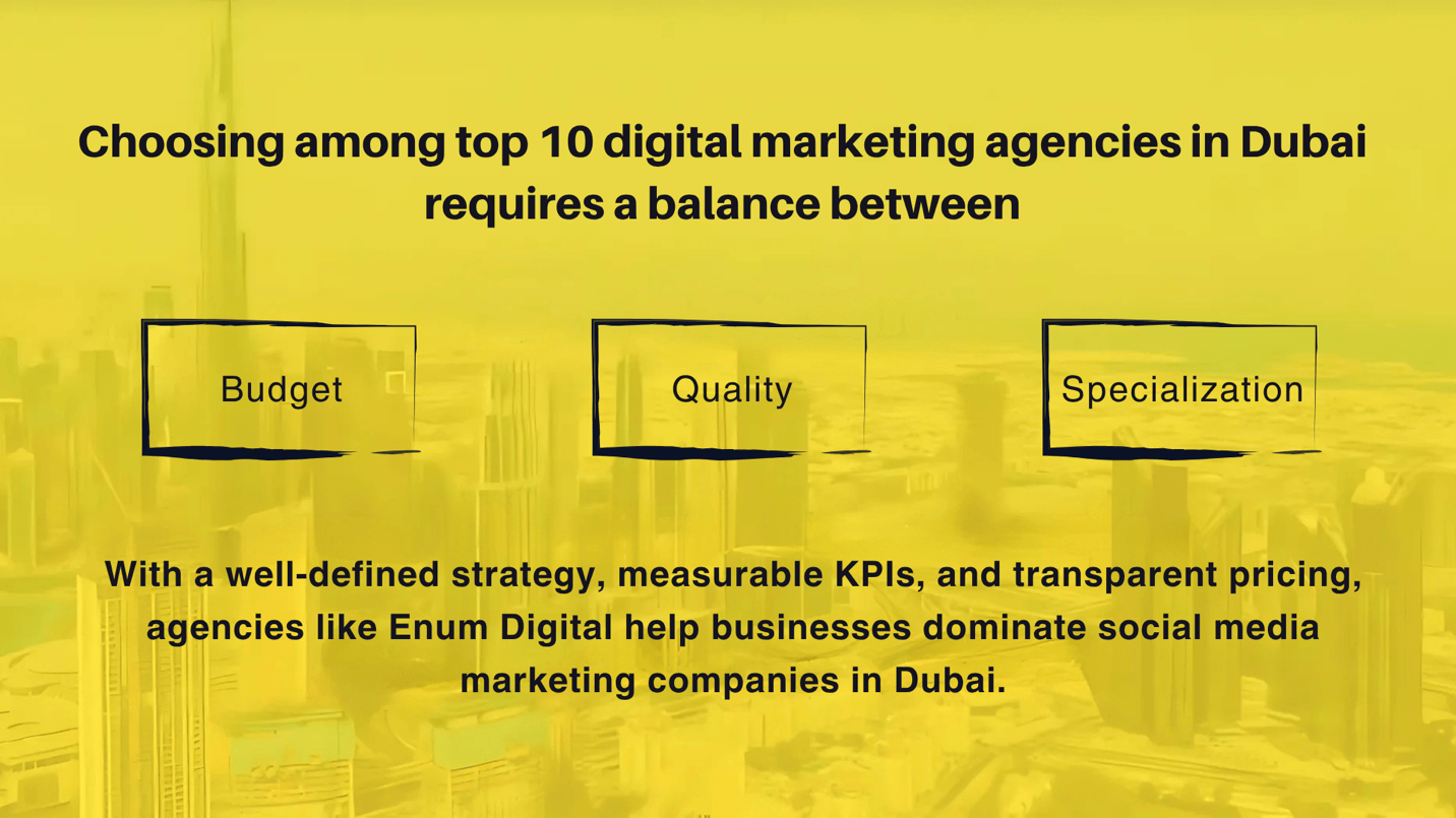 Choosing among top 10 digital marketing agencies in Dubai requires a balance between budget, quality, and specialization. With a well-defined strategy, measurable KPIs, and transparent pricing, agencies like Enum Digital help businesses dominate social media marketing companies in Dubai.