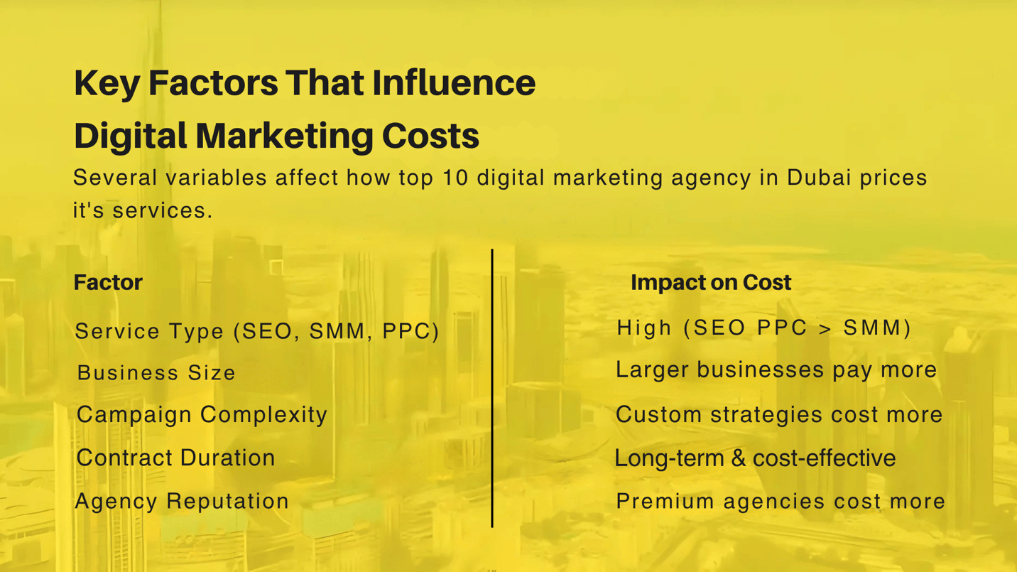Several variables affect how top 10 digital marketing agency in Dubai prices its services: